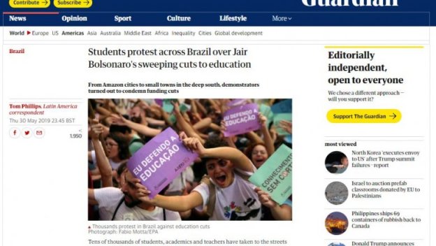 Já o famoso diário britânico The Guardian, conta que “de norte a sul do país, das cidades da Amazônia até as pequenas cidades no extremo sul do Brasil, os manifestantes marcharam para condenar as medidas altamente controversas de Bolsonaro, ao cortar o financiamento da educação pública e da ciência”.