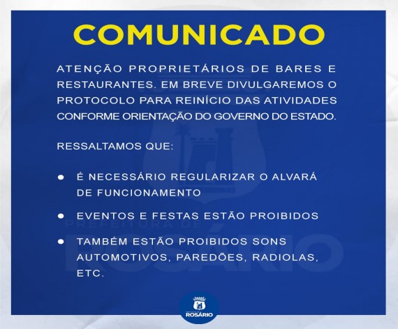 A Prefeitura Municipal de Rosário, através da Secretaria Municipal de Saúde, informa a todos que adotou os protocolos sanitários e as medidas de contenção ao novo coronavírus para a abertura de bares e restaurantes contidas na portaria estadual nº 42, de 24 de junho de 2020.