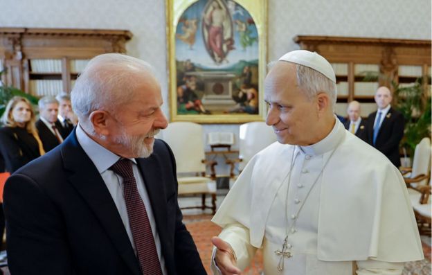 O presidente Luiz Inácio Lula da Silva se encontrou nesta segunda-feira (13), pela primeira vez, com o papa Leão 14. “Disse a ele que precisamos criar um amplo movimento de indignação contra a desigualdade”, declarou Lula pelas redes sociais após ser recebido pelo líder da Igreja Católica no Vaticano.
