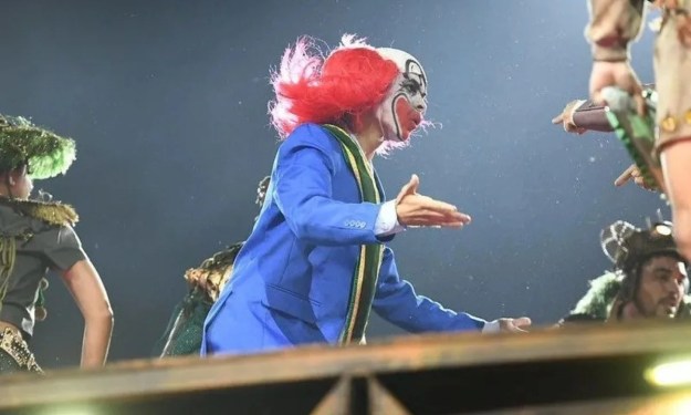 Outro destaque foi a representação do ex-presidente Jair Bolsonaro como um palhaço. Em um dos carros alegóricos, ele aparecia de terno azul caracterizado como “Bozo”. Em outra alegoria, surgia com uniforme de presidiário e tornozeleira eletrônica danificada, em referência a um episódio político recente.